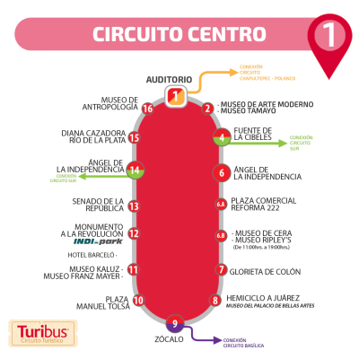 Disfruta las maravillas de la Ciudad de México y llega a lugares increíbles paseando en recorridos por las zonas más importantes de la Ciudad; baja y sube del Turibus cuantas veces quieras en el mismo día. Asómbrate en todo momento a través de un recorrido que ofrece un panorama de lo más bonito de la Ciudad a través de su arquitectura, monumentos, museos y sabores únicos en el mundo; (el traslado del hotel a la parada del Turibus y viceversa no están incluidos).